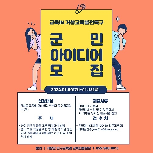 거창군 교육에 관심 있는 학부모 등 군민 누구나 신청이 가능하며, 3개 분야(△아이 키우기 좋은 교육환경 조성 방법, △관내 학교 육성을 위한 행·재정적 지원 방법, △지역인재 유출 방지를 위한 고교-대학-지역 연계 방법)로 나눠 모집한다.