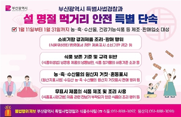 부산시 특별사법경찰과가 설 명절을 앞두고 11일부터 오는 31일까지 제수․선물용 농식품 원산지 둔갑 행위 등 불법 유통행위에 대한 '설 명절 먹거리 안전 특별단속'을 한다고 밝혔다.