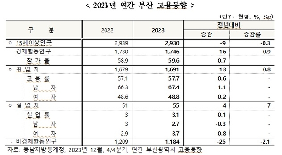 연간 경제활동인구는 174만6천 명으로 2022년 연간 대비 1만6천 명(0.9%) 증가했다. 경제활동참가율은 59.6%로 2022년 대비 0.7%p 상승해 2002년 이후 최고 수치를 기록했다.