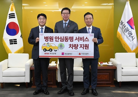 BNK부산은행이 11일 부산시청에서 부산사회복지공동모금회와 함께 ‘병원 안심동행 서비스 차량지원’ 전달식을 가졌다고 밝혔다.