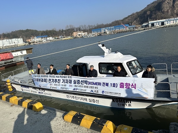 한국조선해양기자재연구원(KOMERI)이 12일 충남 서천 장항 신항만 부두에서 '스마트 수송인프라 기반 고성능 전지 소재·부품 기술사업화 플랫폼 구축 사업'의 일환으로 개발을 완료한 전기추진 기자재 실증선(선명: KOMERI ES 1호)의 출항식을 개최했다.