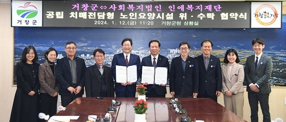 경남 거창군은 지난 12일 군청 상황실에서 구인모 군수, 조성철 사회복지법인 인애복지재단 대표이사 및 관계자가 참석한 가운데 거창군 공립 치매전담형 노인요양시설 위·수탁 협약식을 가졌다.