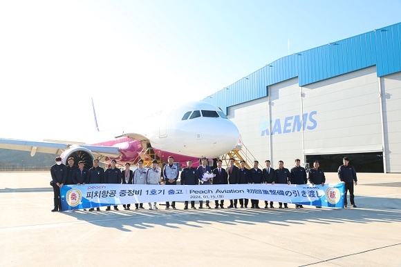 경남 사천시는 15일 한국항공서비스(KAEMS)에서 일본의 피치항공사 기체 중정비 1호기 출고 기념행사를 가졌다.