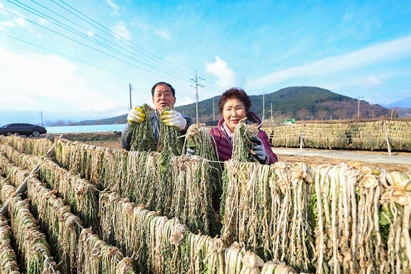 16일 경남 산청군 단성면 묵하마을에서 이형석-유필순 부부가 출하를 앞둔 시래기를 살피고 있다. 산청 시래기는 지리산 자락의 큰 일교차로 얼었다 녹았다를 반복해 고소한 맛이 특징이다. (사진=산청군 제공)