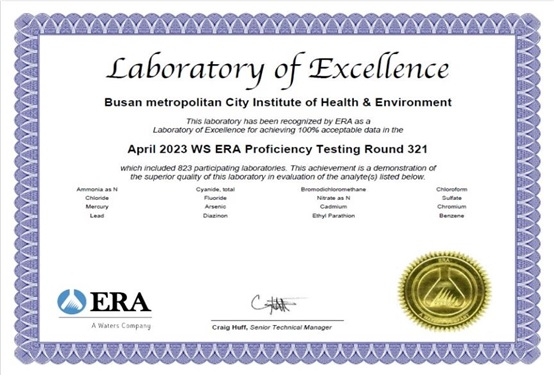 부산시 보건환경연구원이 지난해 미국 환경자원학회(ERA)가 주관한 국제숙련도 평가 결과 모든 항목에서 최고등급인 '만족(Satisfactory)'을 받았다고 밝혔다.