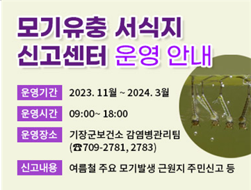 부산 기장군이 각종 감염병 매개체인 모기 개체 수 감소를 위해 오는 3월까지 동절기 집중 모기유충 구제사업을 추진한다고 17일 밝혔다.