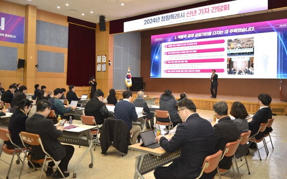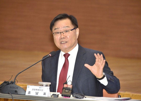 홍남표 창원시장이 18일 오전 시청 시민홀에서 신년 기자간담회를 열고 올해 시의 핵심 키워드인 '혁신성장 전환 가속화'를 골자로 한 시정운영 방향을 발표했다.