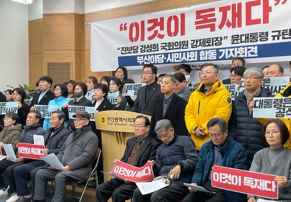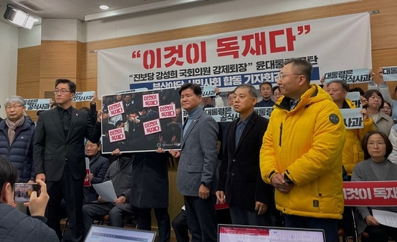 강성희 진보당 의원(전주을)이 대통령경호처 경호원들에 의해 강제로 끌려 나간 일과 관련해 부산지역 야권과 시민단체들이 윤석열 대통령을 규탄하고 나섰다.