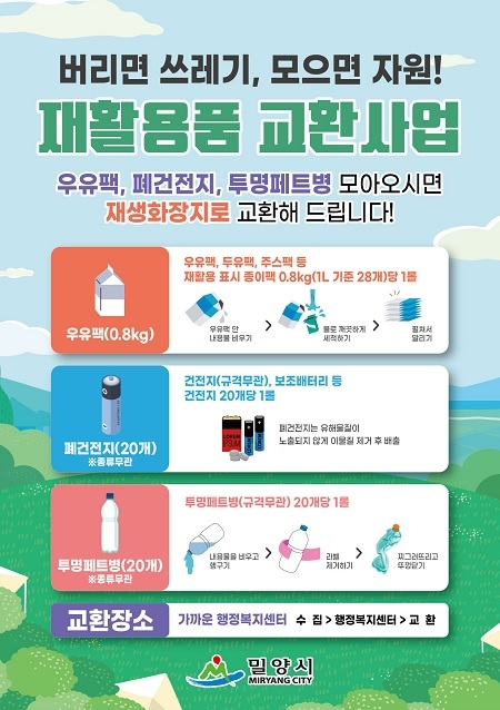 경남 밀양시는 폐자원의 재활용 가치를 시민들에게 공유하고 재활용률을 높이기 위해 기존에 시행하고 있던 교환사업에서 우유팩 교환기준을 변경하고 투명페트병 교환을 추가한다고 22일 밝혔다.