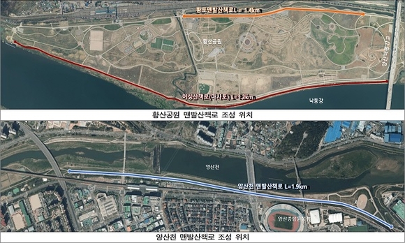 황산공원 맨발 산책로는 시오리 이팝로드(황산캠핑장 ~ 낙동강교) 내 황톳길 1.4km와 강변 산책로(물금취수장 ~ 낙동강교) 내 기존 마사토길 3.2km를 정비하며, 양산천 맨발 산책로는 엄정행길 ~ 삽량로 구간 기존 마사토길을 3.0km 정비할 예정이다.