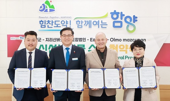 경남 함양군은 24일 오후 군수실에서 이엔비(E&B)무역, 지리산버섯영농조합법인, 스페인 올모 마스쿠냔(OlMo Mazcuñan)사와 농특산물 유통 확대를 위한 업무협약을 체결했다.