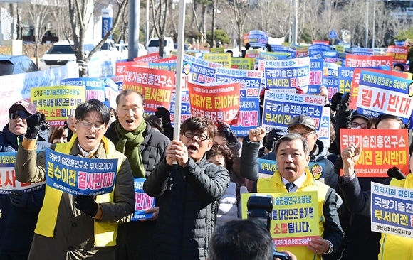 경남진주혁신도시지키기 범시민 운동본부는 26일 국방기술진흥연구소 앞에서 회원 150여 명이 참석한 가운데 국기연 부서 이전 결사반대 집회를 가졌다.