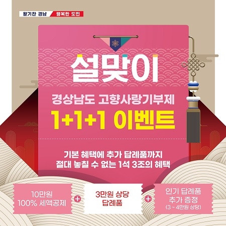 경남도는 2월 1일부터 18일까지 설맞이 고향사랑기부제 특별 이벤트를 진행한다고 31일 밝혔다.