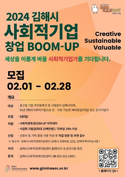경남 김해시는 '2024년 사회적기업 창업 BOOM-UP(붐업)'에 참여할 예비, 초기 창업자를 모집한다고 2일 밝혔다.