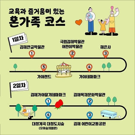 온 가족 코스는 1일차 김해한글박물관 → 국립김해박물관 어린이박물관 → 해은사 → 가야테마파크 → 가야랜드, 2일차는 김해가야딸기테마파크 → 김해목재문화박물관 → 김해어린이교통공원 → 대청계곡 대청도시숲(유아숲체험원) 순이다.