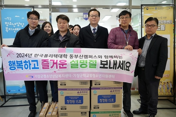 부산시 기장군도시관리공단 기장군청소년상담복지센터가 지난 5일 한국폴리텍대학 동부산캠퍼스로부터 후원받은 설 명절 선물세트를 취약 계층 및 학교 밖 청소년 30여 가정에 전달했다.