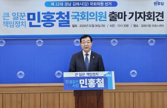민홍철 의원은 6일 오전 22대 국회의원 선거 김해시갑 예비후보 등록 후 시청 프레스센터에서 출마의 변을 밝혔다.