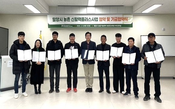 경남 밀양시는 지난 6일 농업기술센터 농업인교육관에서 농촌 신활력플러스사업 추진단과 액션 그룹 주도형 기획사업 참여자인 8개 그룹이 참여해 상호 간의 원활한 사업 추진을 위해 농촌 신활력플러스사업 협약 및 기금 협약식을 가졌다.