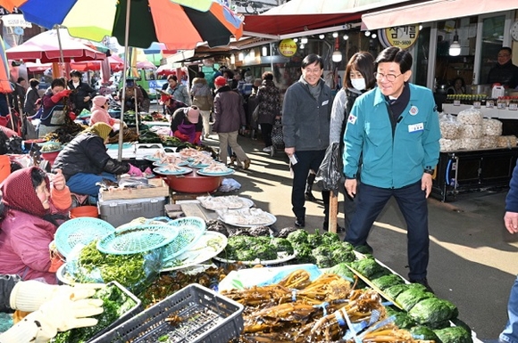 정종복 기장군수가 설 명절을 앞두고 8일 기장시장을 찾아 시장상인과 소통하며 민생현장 점검에 나섰다고 밝혔다.