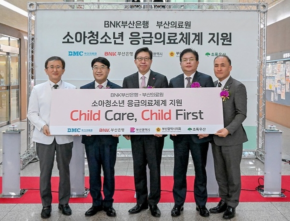 BNK부산은행이 13일 부산의료원에서 초록우산어린이재단과 함께 ‘소아청소년 응급의료체계’ 지원 전달식을 가졌다고 밝혔다.