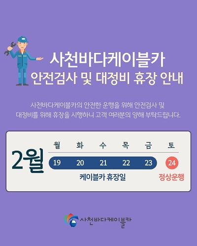사천바다케이블카는 대정비 기간 동안 대방·초양·각산정류장 안전점검을 비롯해 비파괴검사(NDT), 브레이크, 지주 등에 대한 안전상태도 일제히 점검한다.
