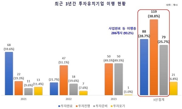 307개 사 중 시설 준공 등 투자를 완료한 기업은 88개 사, 부지 계약·설계·착공 등 투자 진행 중인 기업은 119개 사, 산업단지 조성 중, 투자자금 확보 등으로 투자 준비 중인 기업은 79개 사(25.7%)로 실제 투자 이행 중인 기업은 전체 대비 93.2%(286개 사)로 나타났다. 이외에 경영 악화 등으로 인한 투자 포기 기업은 21개 사(6.8%)로 확인됐다.