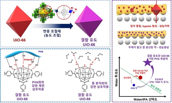 국립부경대학교 공업화학전공 조계용 교수 연구팀은 금속 유기 골격체(MOF) 중 하나인 UiO-66 나노입자에 의도적으로 결함을 유도하고, 이 결함이 복합막의 제조와 성능에 미치는 영향을 분석해 고성능 복합막을 개발하는 데 성공했다.