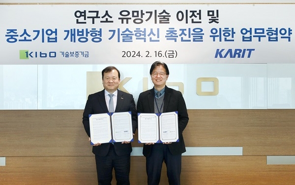 기술보증기금이 한국연구소기술이전협회(KARIT)와 16일 기보 서울사무소에서 ‘연구소 유망기술 이전 및 중소기업 개방형 기술혁신 촉진을 위한 업무협약’을 체결했다고 밝혔다.