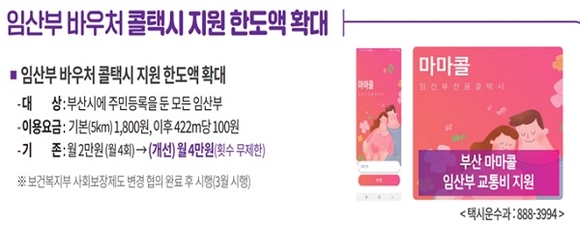 부산시가 다음달 1일부터 임산부 콜택시(마마콜)의 지원 한도를 상향한다고 밝혔다.
