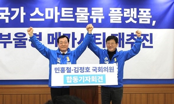 더불어민주당 민홍철(김해시갑), 김정호(김해시을) 국회의원이 19일 오전 시청 프레스센터에서 민주당 후보 단수 공천 합동기자회견을 열고 제22대 총선에 임하는 각오를 밝혔다.