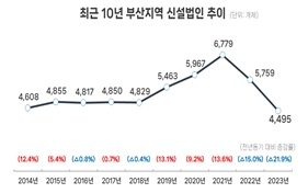 지난해 부산지역 신설법인수가 2022년에 이어 2년 연속 큰 폭으로 감소한 가운데 10년 전인 2014년 수준에도 미치지 못한 것으로 나타났다. 이로 인해 코로나 종식 이후에도 좀처럼 회복하지 못하는 지역경제의 침체에 대한 우려의 목소리도 더욱 커질 전망이다.