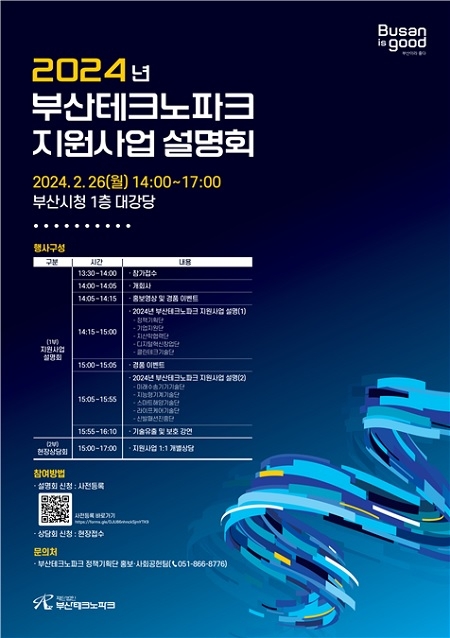 부산테크노파크(부산TP)가 오는 26일 오후 2시 부산시청 1층 대강당에서 부산 소재 기업인 대상으로 ‘2024년 부산TP 지원사업 설명회’를 개최한다고 밝혔다.