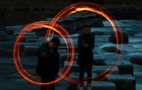 정월대보름을 사흘 앞둔 지난 21일 저녁 경남 함양군 함양읍 위천 징검다리에서 마을 주민들이 올 한해 건강을 기원하며 쥐불놀이를 하고 있다. 쥐불놀이는 길게 줄을 단 깡통에 나무를 넣고 불을 붙여 빙빙 돌리며 놀이를 즐기는 정월대보름 대표적 세시풍속이다. (사진=함양군 제공)