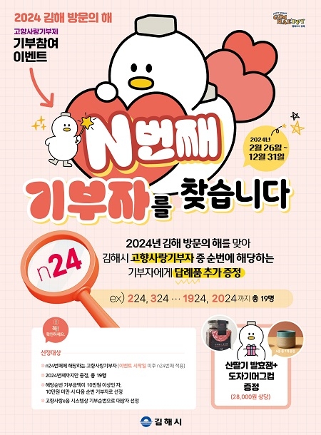경남 김해시는 오는 26일부터 고향사랑기부제 2024년 김해 방문의 해 이벤트를 진행한다고 23일 밝혔다.
