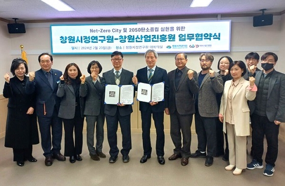 창원시정연구원과 창원산업진흥원은 지난 23일 양 기관 관계자들이 참석한 가운데 'Net-Zero City 및 2050 탄소중립 실현을 위한 업무협약'을 체결했다.