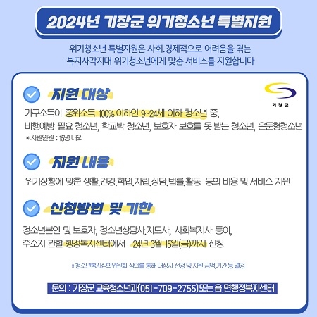 부산 기장군이 복지 사각지대에 놓여 있는 저소득 위기청소년을 위해 특별지원 사업을 추진한다고 26일 밝혔다.