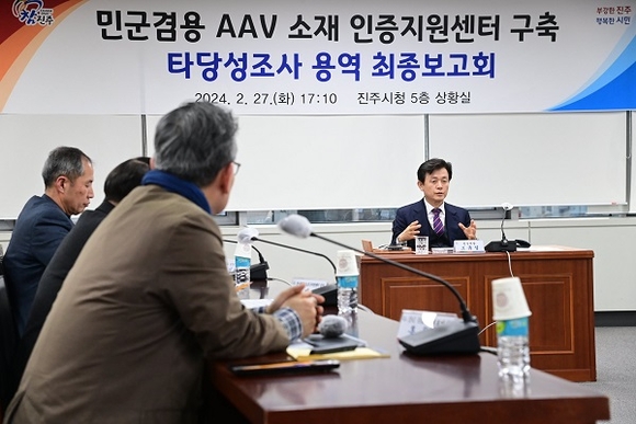 경남 진주시는 지난 27일 시청 5층 상황실에서 '민군겸용 AAV(미래항공기체) 소재 인증지원센터 구축 타당성조사 용역 최종보고회'를 가졌다.