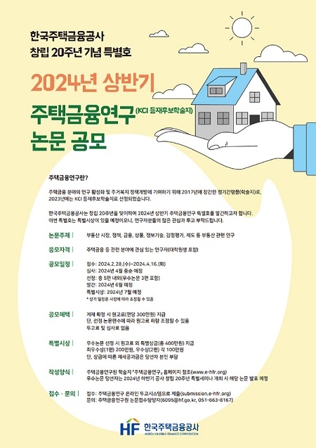 한국주택금융공사(HF)가 창립 20주년을 기념해 2024년 상반기 ‘주택금융연구’ 특별호 논문 공모를 실시한다고 28일 밝혔다.