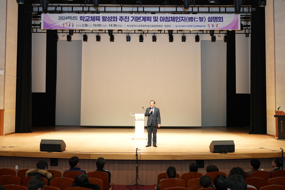 하윤수 교육감이 28일 부산시교육청학생교육문화회관 대강당에서 개최된 ‘2024학년도 학교체육 및 아침체인지 기본계획 설명회’에 참석했다.