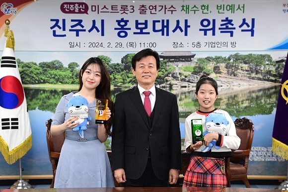 경남 진주시는 29일 시청 5층 기업인의 방에서 TV조선 '미스트롯 3'에 출연 중인 진주 출신 가수 채수현, 빈예서를 진주시 홍보대사로 위촉했다고 밝혔다.