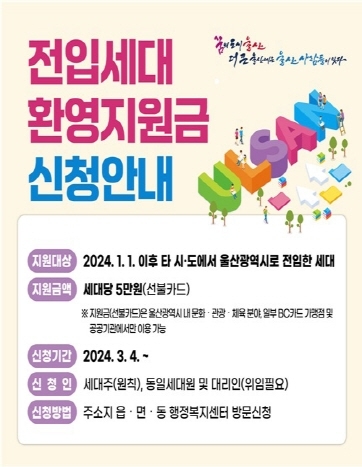 울산시는 4일부터 울산시로 전입한 세대에게 전입세대 환영지원금을 지원한다고 밝혔다.