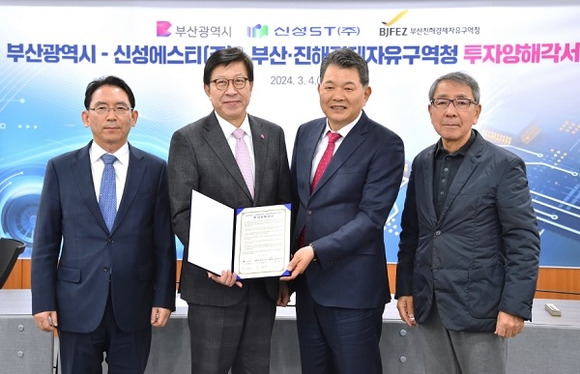 부산시는 4일 신성에스티와 국내복귀 투자양해각서를 체결했다고 밝혔다. 체결식에는 박형준 시장을 비롯해 안병두 신성에스티 대표이사, 구자천 신성델타테크 대표이사, 김기영 부산진해경제자유구역청장 등이 참석했다.