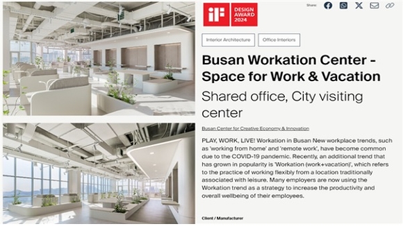 부산시가 독일의 ‘iF 디자인 어워드 2024’에서 '부산 워케이션 거점센터'가 인테리어 부문(사무공간) 본상에 선정됐다고 밝혔다.