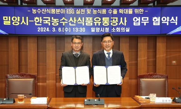경남 밀양시는 6일 시청 소회의실에서 한국농수산식품유통공사(aT)와 저탄소 식생활 실천 확산과 농식품 수출 확대를 위한 업무협약을 체결했다.