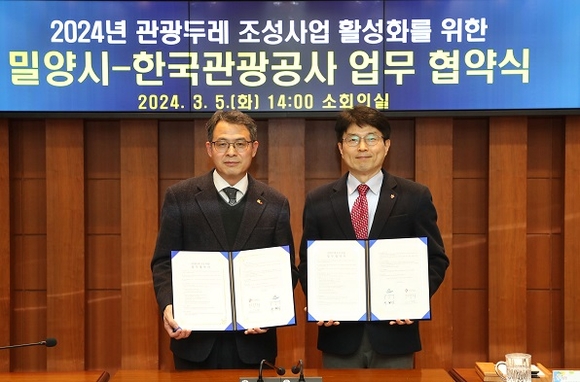 경남 밀양시는 문화체육관광부와 한국관광공사가 주관하는 '2024년 관광두레 조성사업' 공모에 선정, 지난 5일 한국관광공사와 관광두레 조성사업 업무협약을 체결했다.