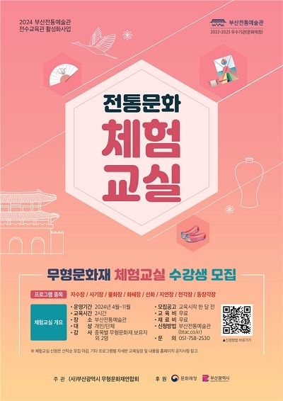 부산시가 오는 4월부터 11월까지 부산전통예술관에서 무형문화재 '전통문화 체험교실' 교육프로그램을 운영한다고 밝혔다.