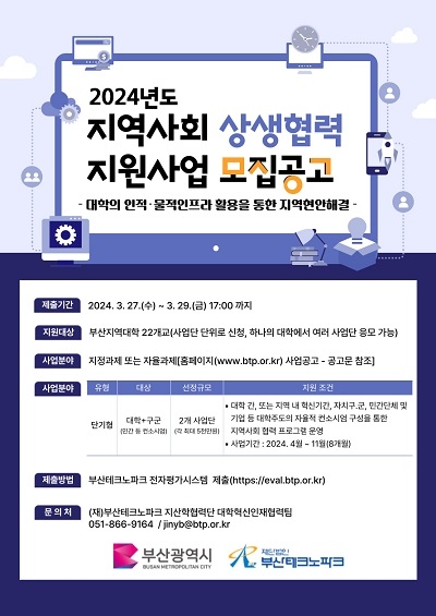 부산테크노파크(부산TP)가 ‘2024년 지역사회 상생협력 지원사업’ 공모를 오는 29일까지 진행한다.