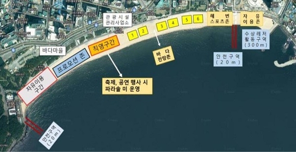 구 직영 공간은 축제나 행사 때 파라솔을 설치하지 않고 비울 예정이다. 올해 처음 운영하는 해운대해수욕장 프로모션존은 백사장 150m 구간이다. 애니메이션 영화제, 게임 체험존, 게임캐릭터 포토존, 백사장 상점 등 해수욕장 방문객들을 위한 다양한 볼거리와 즐길거리를 선보일 예정이다. 송정해수욕장은 6개 구역에 6개 공익단체로 지난해와 동일하다.