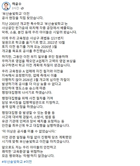 한편 이날 하윤수 교육감이 페이스북에 ‘부산솔빛학교’ 이전을 위한 행정대집행에 대한 피드는 게시한지 1시간만에 250개 이상의 공감을 얻으며 큰 호응을 받고 있다.