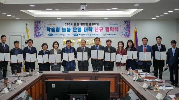 하윤수 부산시교육감이 15일 부산대학교를 비롯한 12개 대학 총장 등 관계자들이 참석한 가운데 ‘2024 학습형 늘봄(초등 통합방과후학교) 운영’ 협약을 체결했다.
